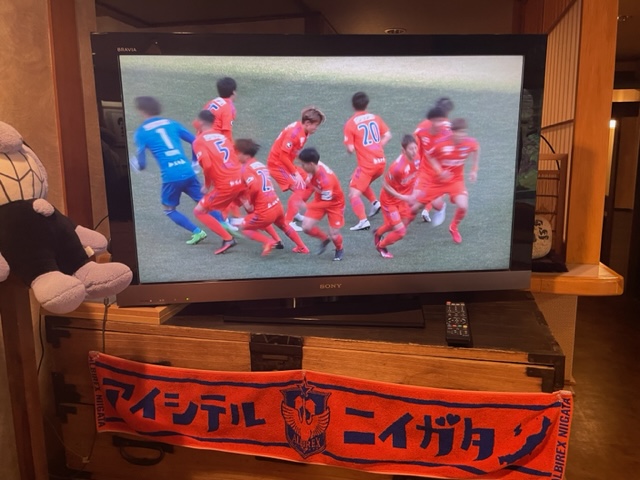 テレビの前にタオマフ貼ってるし、売店のえのもとミートさんの所にアルビのミニ旗飾ってるし、大翔龍さんからもらったうちわとかカレンダー、ポスターあるし入口にのぼりあるし。