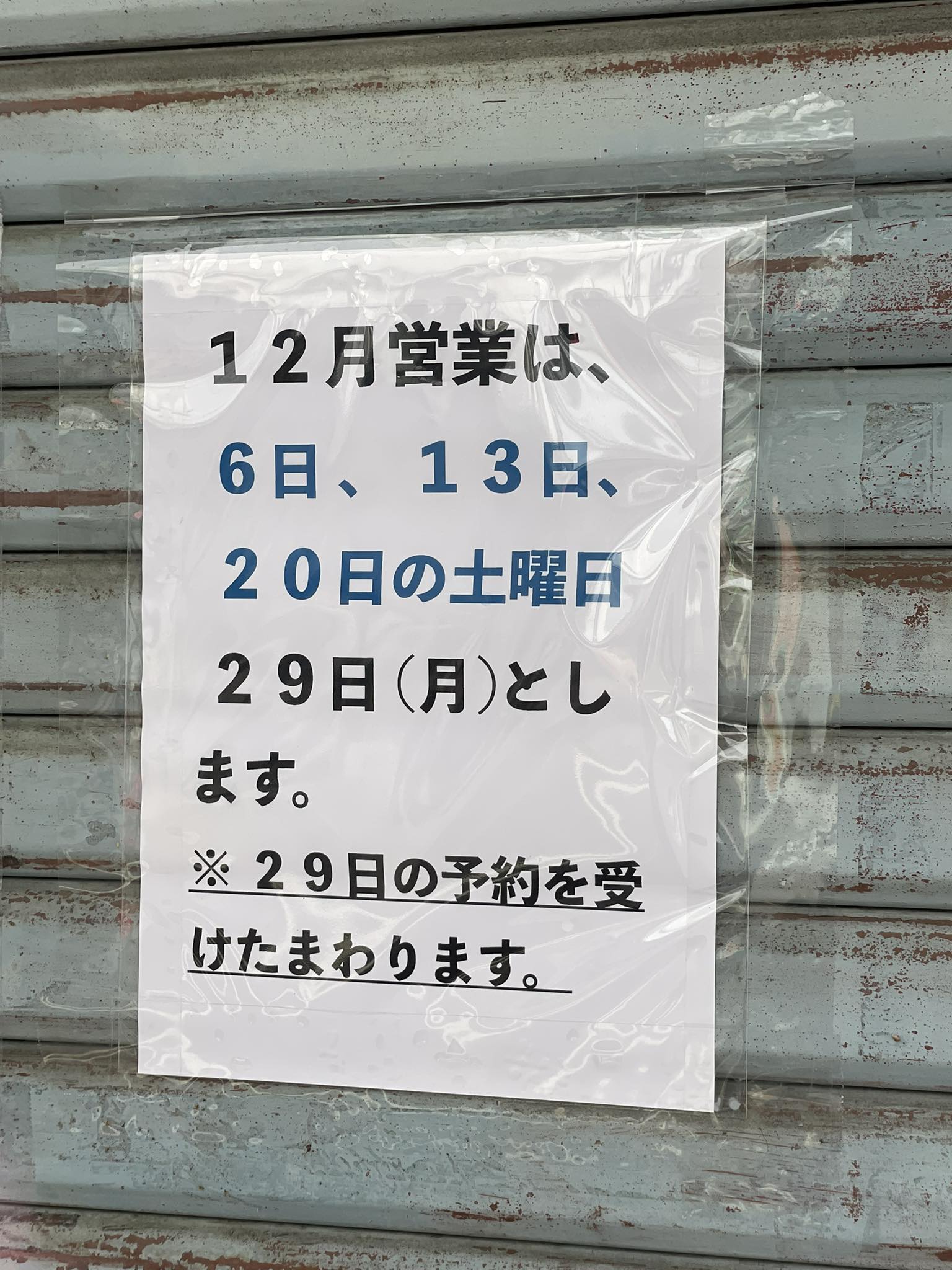 基本毎週土曜日営業ですが、年内は次、20日(土)と最終営業が29日(月)らしく、27日の土曜日はお休みです。29日は枚数予約も受け付けているそうですよ!